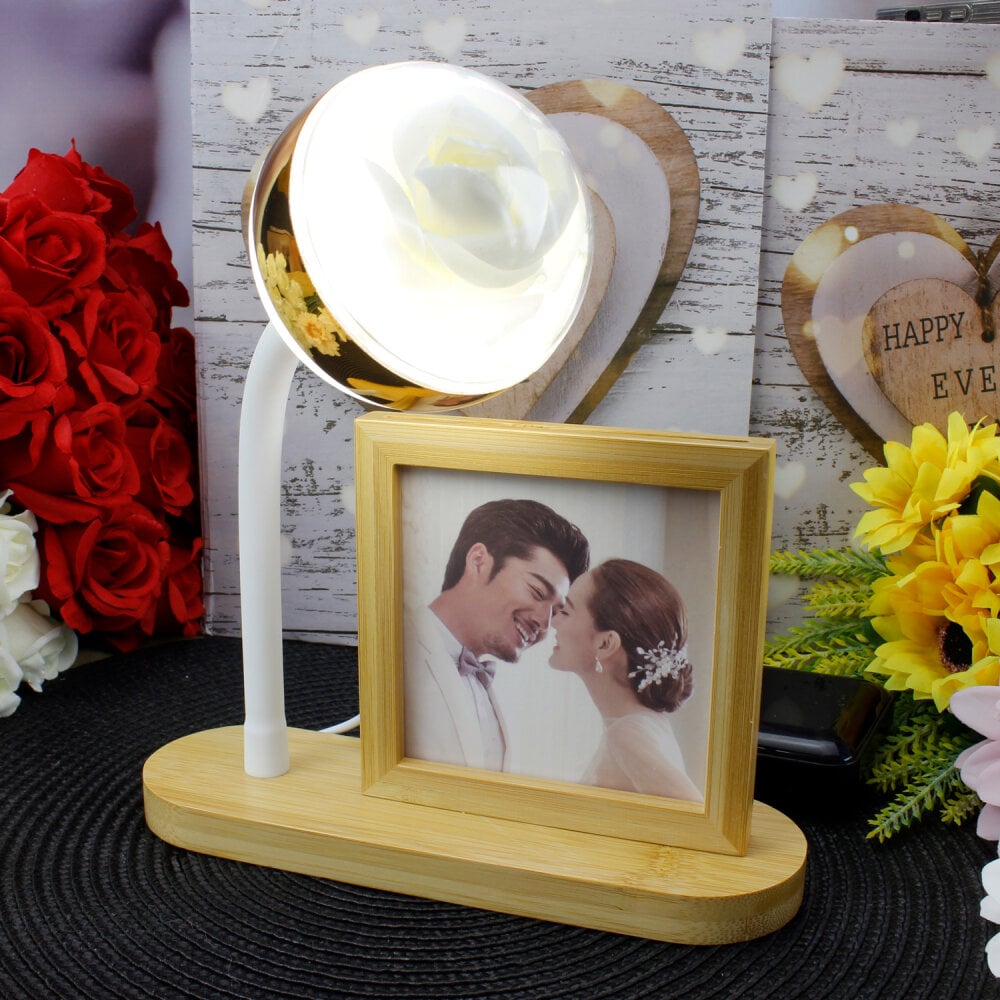 Sade ve zarif tasarımıyla yaşam alanlarına modern bir dokunuş katar. Üst kısmındaki beyaz çiçek detaylı abajur, yumuşak aydınlatmasıyla huzurlu bir ortam oluştururken, alt bölümdeki kare fotoğraf çerçevesiyle kişisel anılarınızı öne çıkarır. 6,5x20x13,5 cm ölçülerindeki ahşap tabanı, doğal dokusuyla dekorasyonunuza sıcaklık kazandırır. Fotoğraf iç çekmece ölçüsü 9 cm, lamba boyu ise 26 cm’dir. USB kablo bağlantısı sayesinde pratik bir kullanım sunar. Yatak odası, salon, ofis veya hediye köşelerinde hem ışık hem de anlam dolu bir obje olarak kullanılabilir. Beyazın zarafetiyle her ortama uyum sağlayan bu lamba, sevdiklerinize özel bir hediye alternatifi olarak da mükemmeldir.