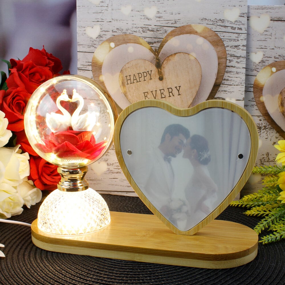 Romantik detaylarıyla yaşam alanlarına sıcak ve duygusal bir atmosfer kazandırır. Şeffaf küre içerisinde yer alan kırmızı çiçekler ve beyaz kuğu figürleri, yandığında yumuşak ve huzurlu bir ışık yayarak ortama zarif bir dokunuş katar. Yan bölümdeki kalp şeklindeki fotoğraf çerçevesi, en özel anılarınızı estetik bir biçimde sergilemenizi sağlar. Çerçeve iç ölçüsü 12,5 cm’dir. Doğal tonlardaki ahşap tabanı, modern ve sıcak bir görünüm oluşturur. USB bağlantısı sayesinde kolaylıkla kullanılabilir. Yatak odası, vitrin, salon veya hediye köşelerinde romantik bir atmosfer oluşturmak için idealdir. Sevdiklerinize anlam dolu bir hediye sunmak veya kendi yaşam alanınıza zarafet katmak isteyenler için mükemmel bir seçimdir.