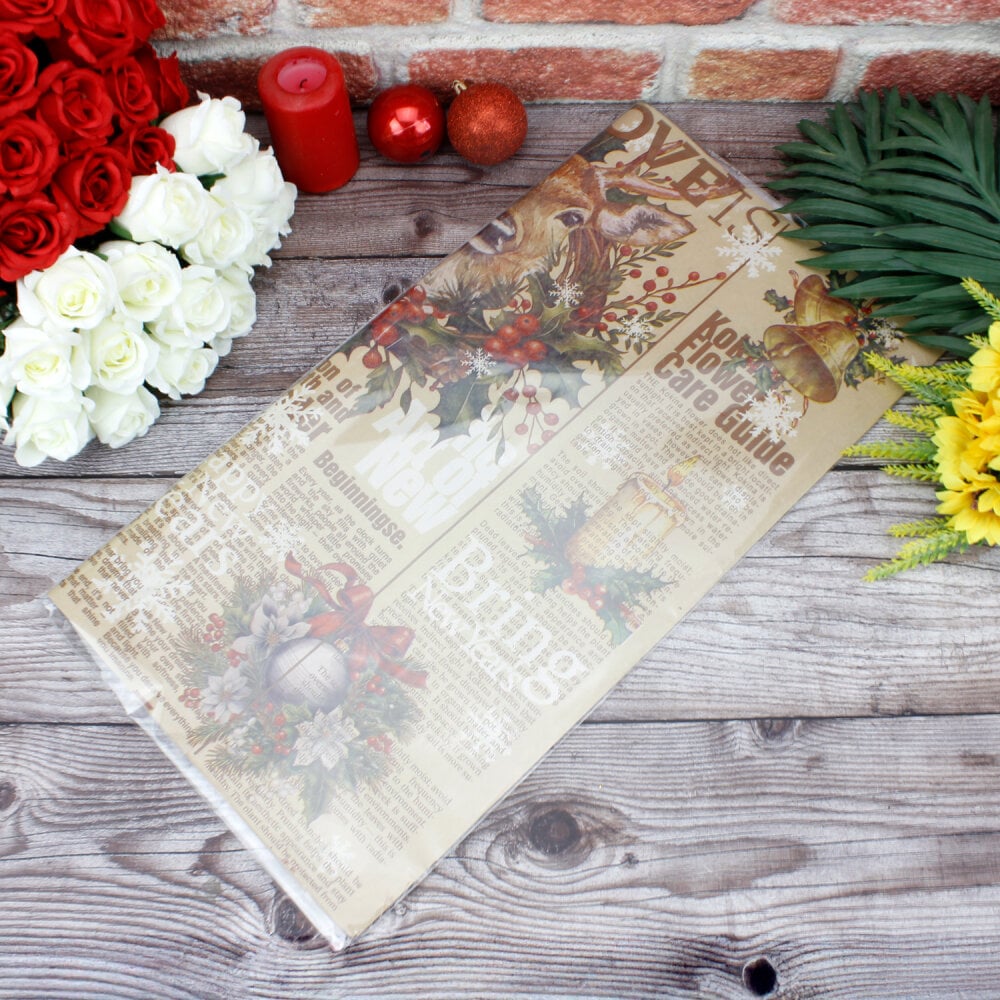 Vintage gazete tarzı tasarımı ve yılbaşı detaylarıyla çiçek aranjmanlarına sıcak ve nostaljik bir hava katmak için özel olarak üretilmiştir. Her pakette 20 adet kare formlu ambalaj kağıdı bulunur ve doğal kraft dokusu sayesinde çiçek buketlerine zarif bir bütünlük sağlar. Üzerindeki yılbaşı çanı, çelenk, mum ve dekoratif yazılar, özellikle yılbaşı döneminde yapılan çiçek aranjmanlarını daha şık ve tematik hale getirir. 56x56 cm ölçüsü, küçük ve orta boy buketler için ideal boyuttadır. Dayanıklı yapısı sayesinde kolay yırtılmaz ve buketin formunu koruyarak düzenli bir görünüm sağlar. Floristlerde, hediye paketleme alanlarında, çikolata ve hediyelik sunumlarında da rahatlıkla kullanılabilir. Hem estetik hem de pratik bir ambalaj çözümü sunan bu model, yılbaşı temasına uygun şık bir sunum yapmak isteyenler için mükemmel bir tercihtir.