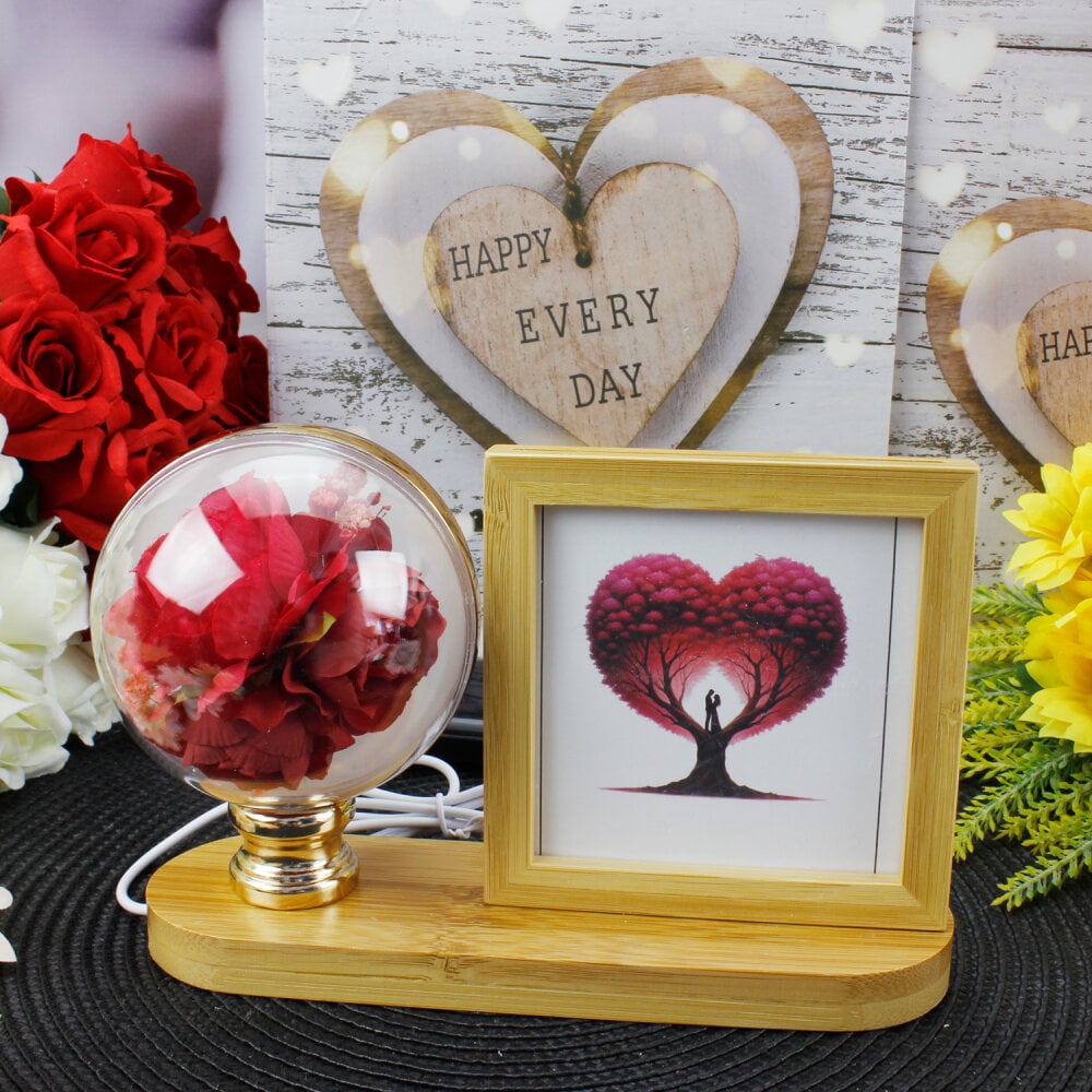Estetik tasarımıyla hem dekoratif hem de anlam dolu bir obje olarak öne çıkar. Şeffaf küre içindeki kırmızı çiçek detayı, sıcak ışığıyla ortama romantik bir hava katar. Yan kısmındaki kare fotoğraf çerçevesi, sevdiklerinle paylaştığın özel anıları sergilemek için idealdir. 6,5x20x13,5 cm ölçülerindeki ahşap tabanı, doğal dokusuyla ortama zarif bir görünüm kazandırır. Lamba kısmının çapı 10 cm’dir. USB bağlantısı sayesinde kolaylıkla kullanılabilir. Yatak odası, salon, vitrin veya özel hediye köşelerinde dekoratif bir detay olarak dikkat çeker. Hem romantik bir hediye seçeneği hem de yaşam alanlarına sıcaklık katacak modern bir dekor objesidir. Şıklığı ve anlamı bir arada sunar.