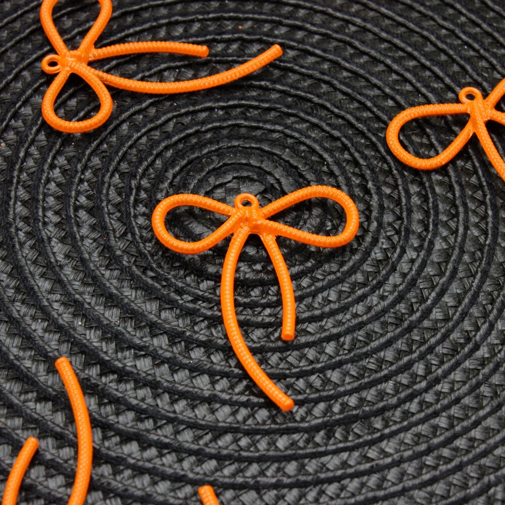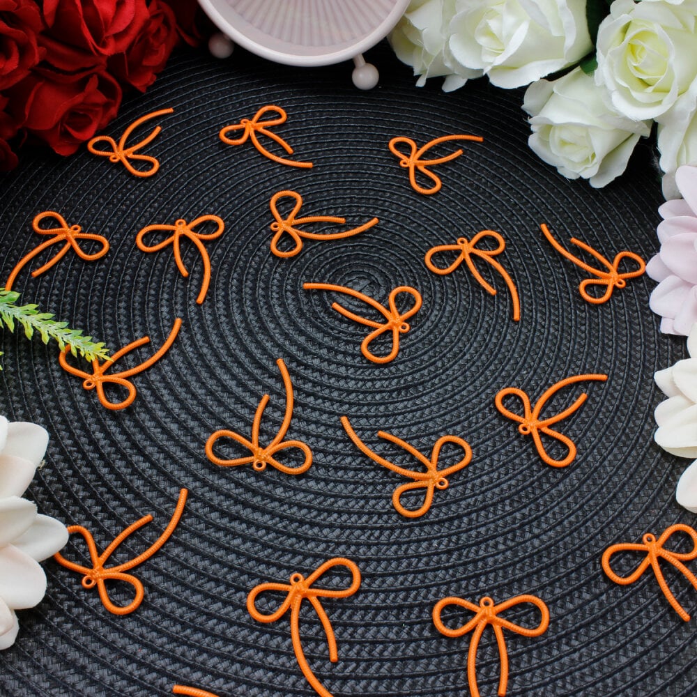 Turuncu rengin sıcak tonları, tasarımlara canlılık ve özgünlük kazandırırken, fiyonk detayı romantik bir görünüm oluşturur. Üzerinde yer alan küçük bağlantı halkası sayesinde anahtarlık aparatlarına veya klipslere kolayca takılabilir. El yapımı hediyeliklerde, kişisel aksesuar projelerinde ya da butik tasarımlarda tamamlayıcı bir detay olarak öne çıkar.