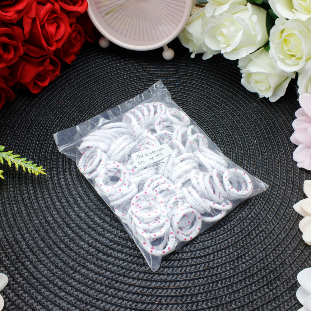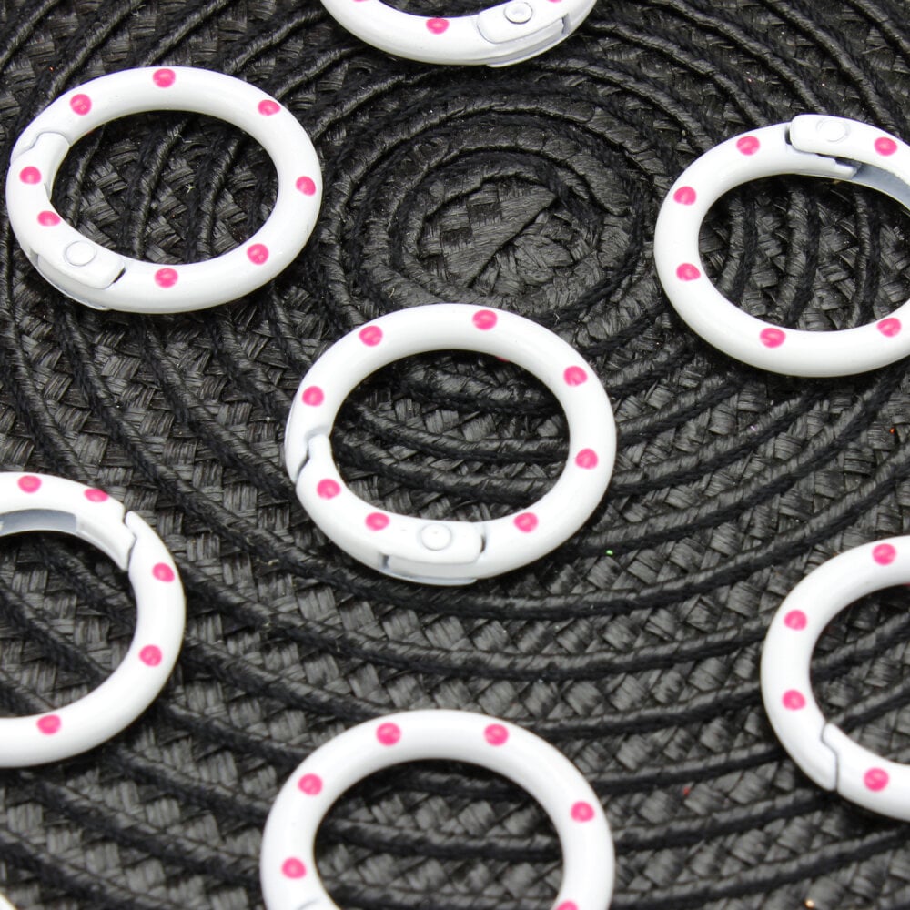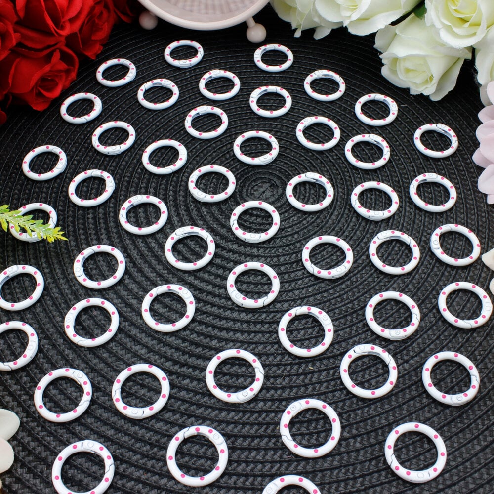 Zarif ve sade tasarımıyla her türlü el yapımı projeye şıklık kazandırır. 2,5 cm çapındaki bu halka, beyaz zemin üzerine işlenmiş pastel puantiye detaylarıyla dikkat çeker. Minimalist tarzı sayesinde çanta, anahtarlık, takı ve dekoratif süsleme çalışmalarında kolayca uyum sağlar.