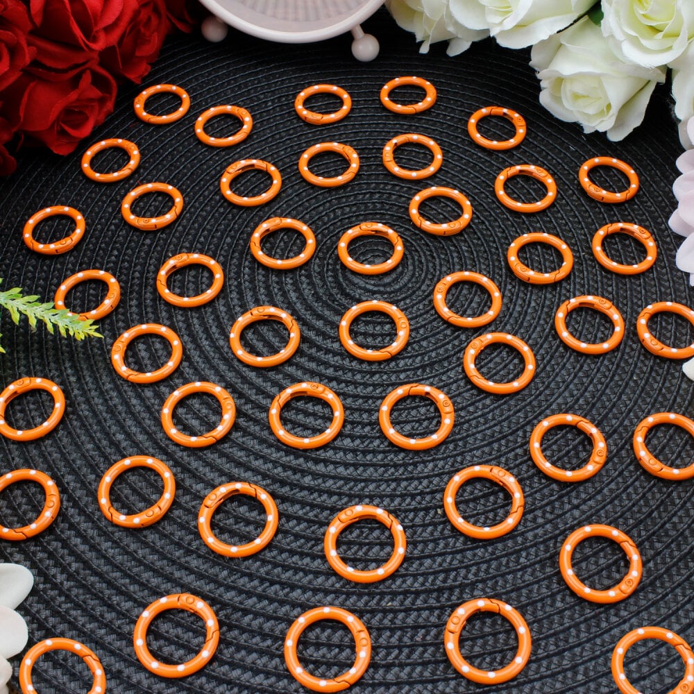 Enerjik rengiyle el yapımı projelere canlılık ve sıcaklık katar. 2,5 cm çapındaki bu zarif halka, turuncu zemin üzerine yerleştirilmiş sarı ve beyaz puantiye detaylarıyla hareketli bir görünüm sunar. Renkli tasarımı sayesinde çanta, anahtarlık, takı ve çeşitli hobi çalışmalarında neşeli bir tamamlayıcı olarak öne çıkar.
