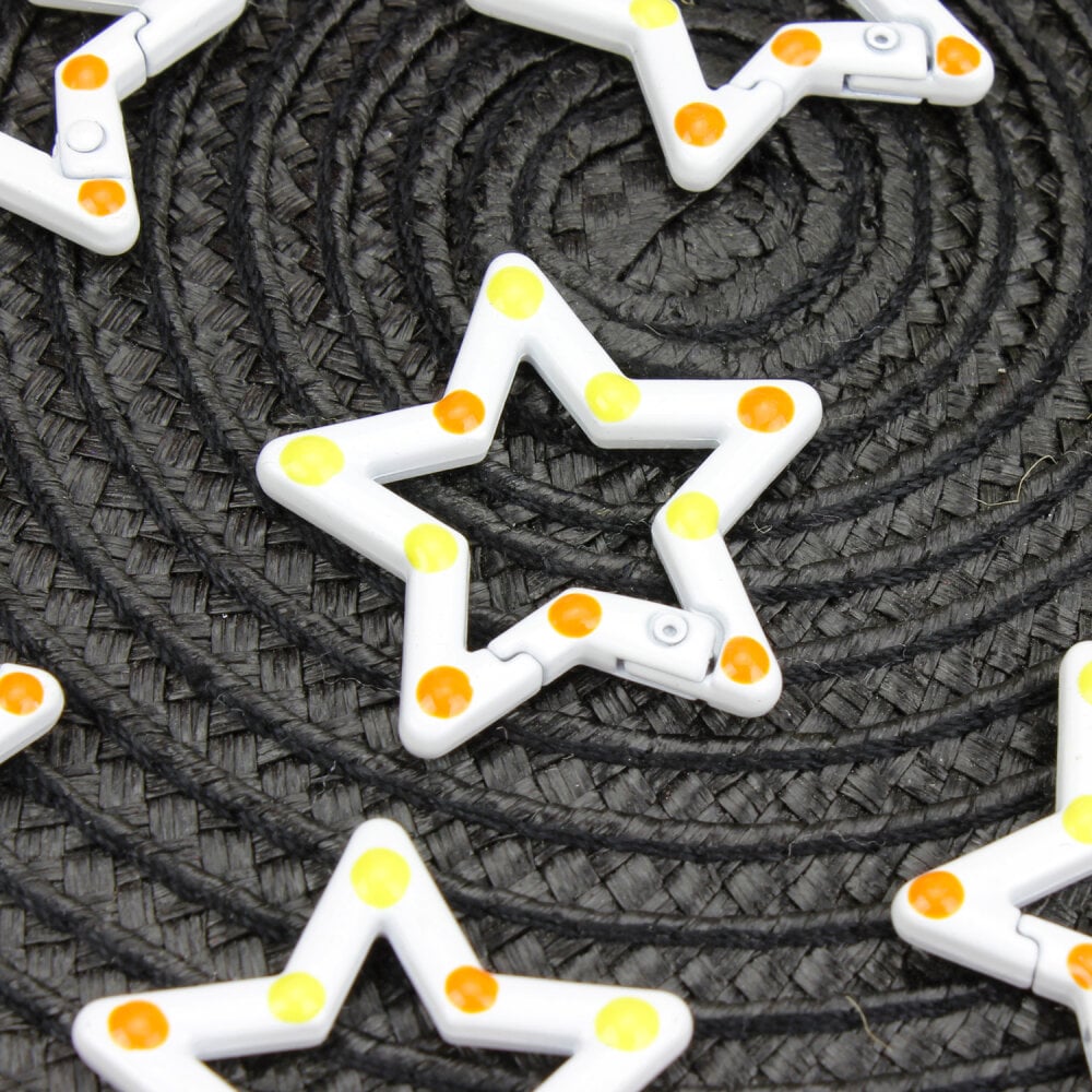 Sade zarafetiyle her tasarıma uyum sağlayan şık bir detaydır. 3 cm boyutundaki yıldız formu, beyaz zemin üzerine kırmızı ve yeşil tonlu puantiyelerle süslenmiştir. Parlak görünümüyle çanta, cüzdan, anahtarlık ve takı tasarımlarında dikkat çekici bir tamamlayıcı olarak öne çıkar.