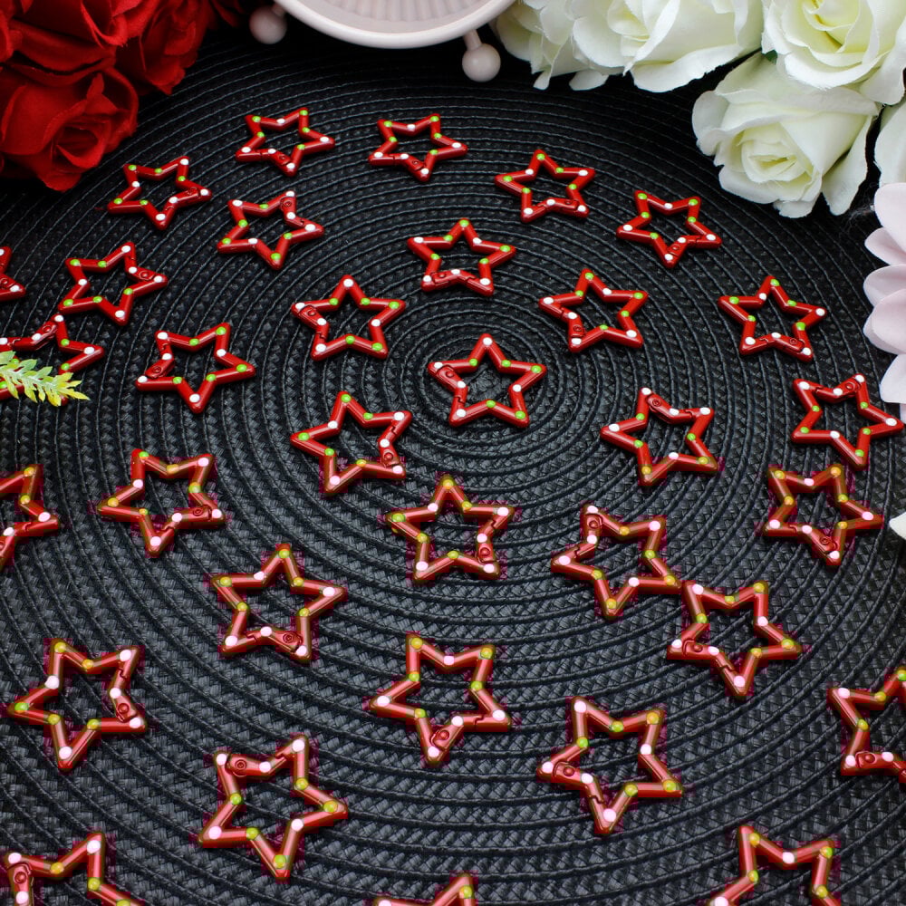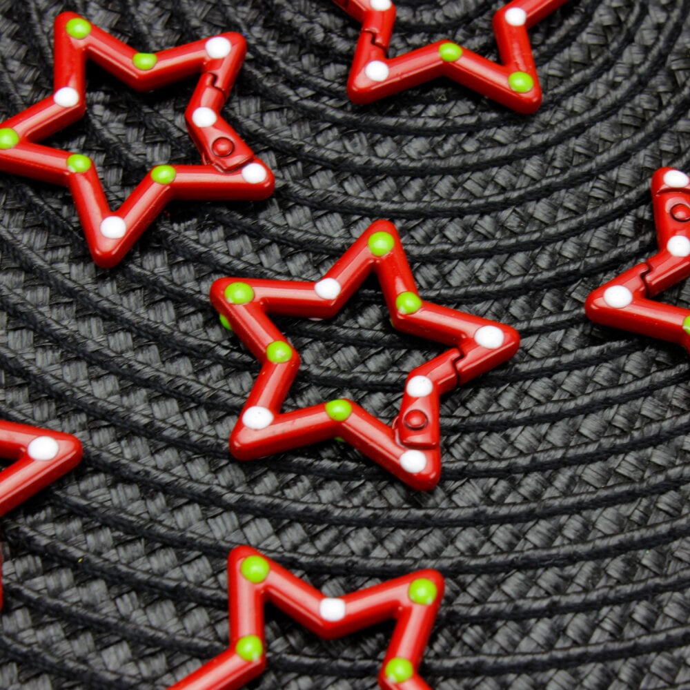 Parlak rengi ve eğlenceli tasarımıyla el yapımı projelere neşe katar. 3 cm boyutundaki yıldız formu, kırmızı zemin üzerine beyaz puantiyeler ve yeşil detaylarla süslenmiştir. Göz alıcı görünümüyle çanta, cüzdan, anahtarlık ve takı tasarımlarında dikkat çekici bir aksesuar olarak öne çıkar.
