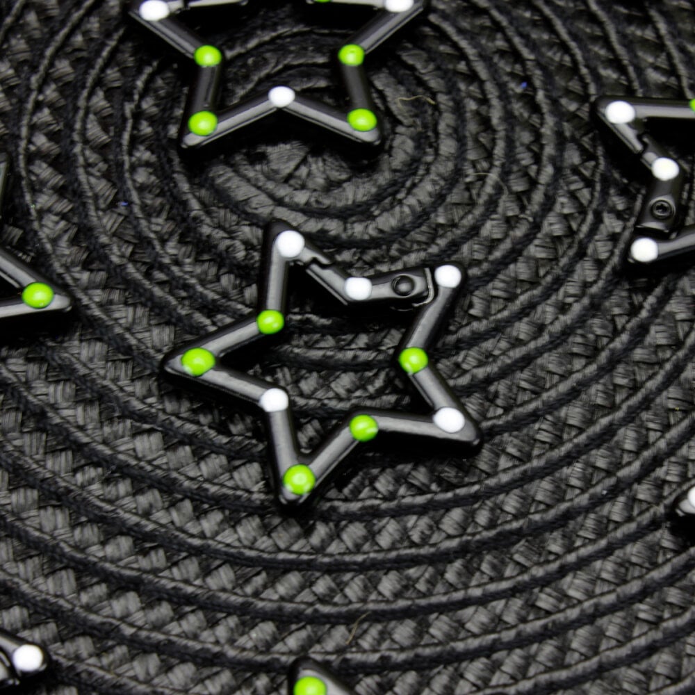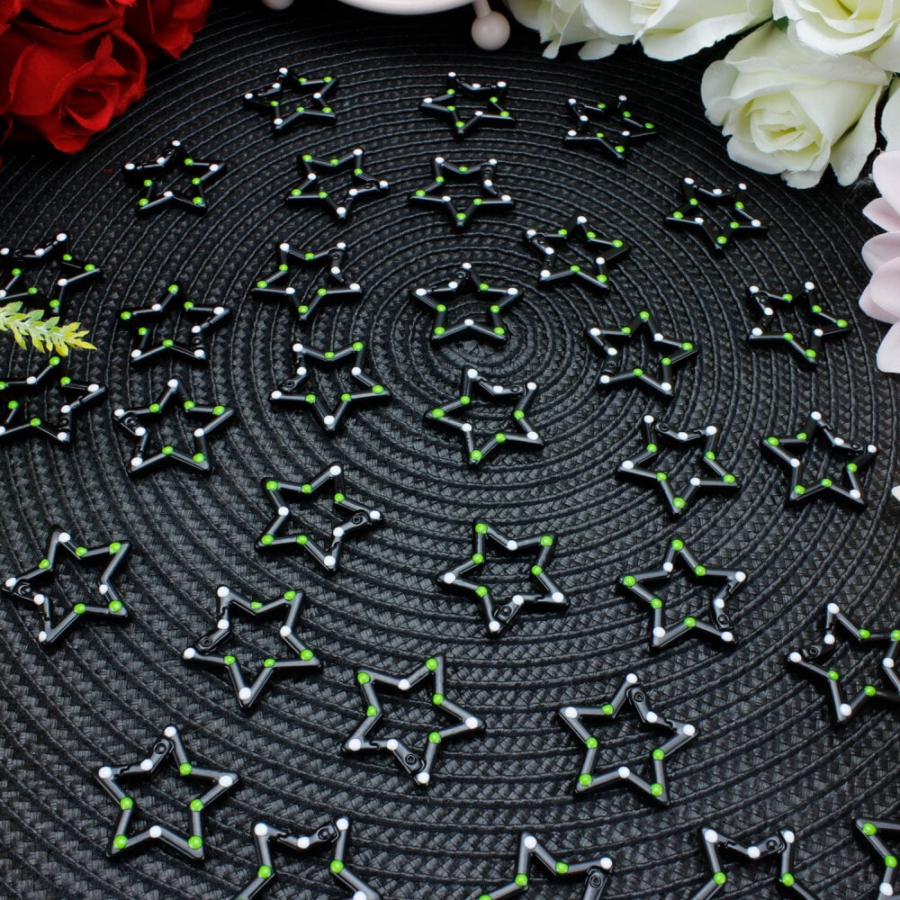 Zarif ve modern görünümüyle el yapımı projelere sofistike bir dokunuş kazandırır. 3 cm boyutundaki yıldız formu, siyah zemin üzerine beyaz puantiyeler ve yeşil detaylarla süslenmiştir. Şıklığıyla çanta, anahtarlık, cüzdan veya takı tasarımlarında dikkat çekici bir aksesuar olarak öne çıkar.