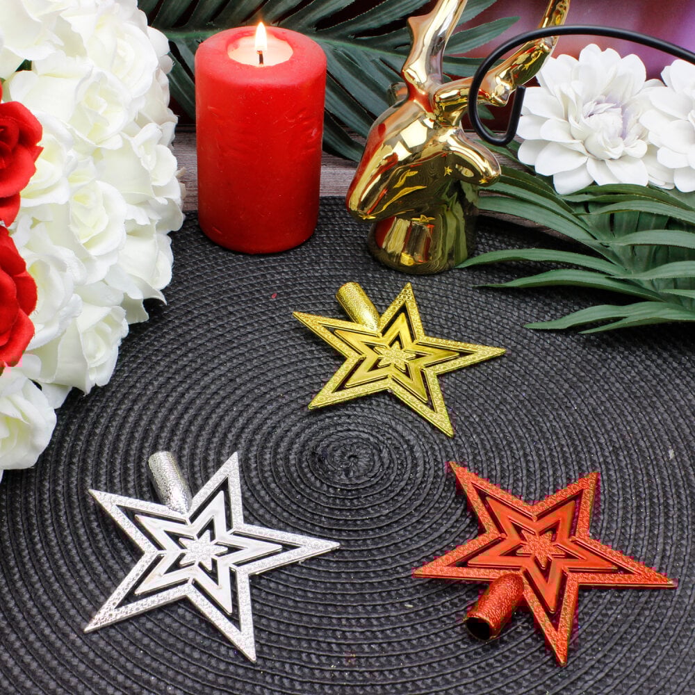 Yılbaşı ağacının tepe kısmına şık ve dikkat çekici bir görünüm kazandırmak için tasarlanmıştır. Paket içerisinde altın, gümüş ve kırmızı renklerde toplam 3 adet yıldız tepe süsü bulunur. Parlak ve detaylı yüzey yapısı ışığı yansıtarak ağacınıza göz alıcı bir ışıltı katar. Alt kısmındaki özel geçirme yuvası sayesinde yılbaşı ağacının tepe dalına kolayca takılır ve sağlam bir şekilde sabitlenir. Hem küçük hem büyük boy çam ağaçlarında uyumlu şekilde kullanılabilir. Dayanıklı yapısı sayesinde tekrar tekrar kullanım için uygundur. Ev, ofis, mağaza vitrinleri ve özel çekim dekorlarında yılbaşı atmosferini ön plana çıkarmak isteyenler için ideal bir tamamlayıcıdır. Ağaç süslemesine final dokunuşunu yaparak, dekorasyonunuza zarafet ve ışıltı ekler.